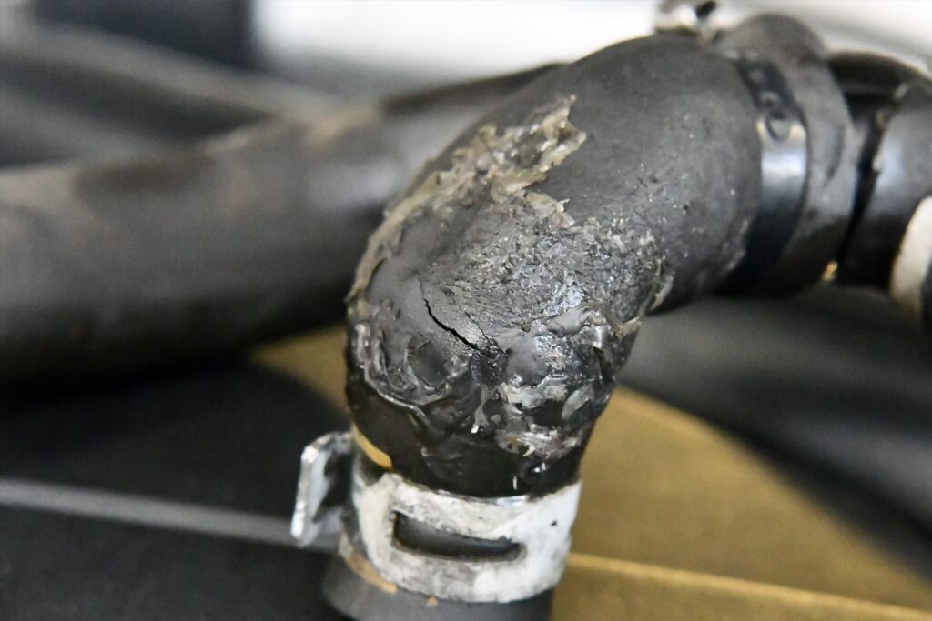 - Przewody chłodnicze: Z biegiem czasu gumowe przewody mogą pękać, tracić elastyczność lub poluzowywać się na złączach, szczególnie pod wpływem zmian temperatur.