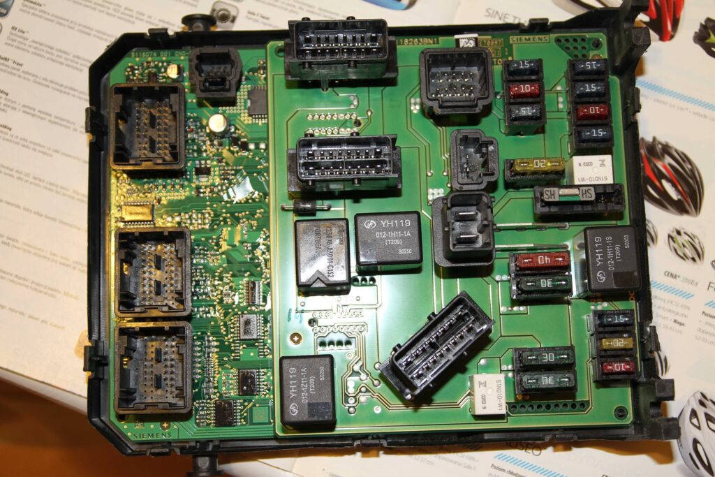 - Moduł BSM (Body Systems Module): BSM, czyli Body Systems Module, zazwyczaj umieszczony jest w komorze silnika, często w pobliżu akumulatora. Jego główną funkcją jest zarządzanie oświetleniem zewnętrznym samochodu (światła mijania, drogowe, pozycyjne, kierunkowskazy, światła stop) oraz innymi urządzeniami, które nie są bezpośrednio sterowane przez ECU silnika, np. wentylator chłodnicy, pompa paliwa, klakson. BSM pełni również rolę w załączaniu zasilania do poszczególnych modułów elektronicznych w samochodzie, działając jako inteligentna skrzynka bezpieczników i przekaźników. Można go określić jako „moduł zasilania i oświetlenia zewnętrznego”.