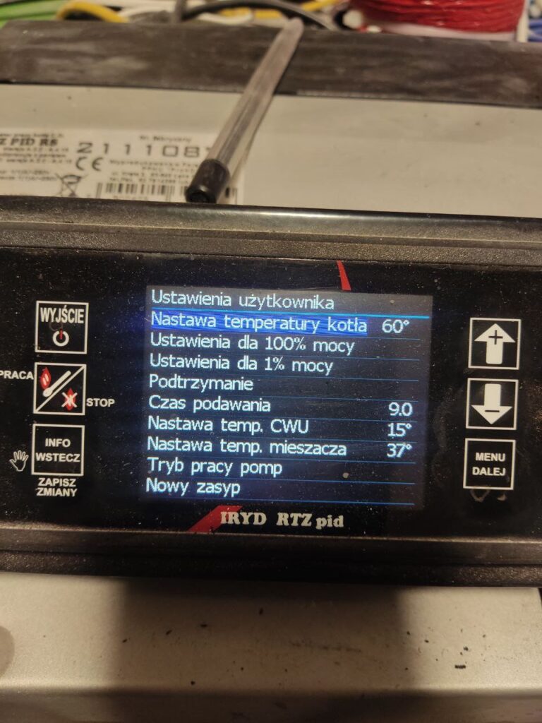 - Moc wentylatorów – wyrażona w procentach, reguluje prędkość obrotową wentylatora, a tym samym siłę nadmuchu powietrza do paleniska.