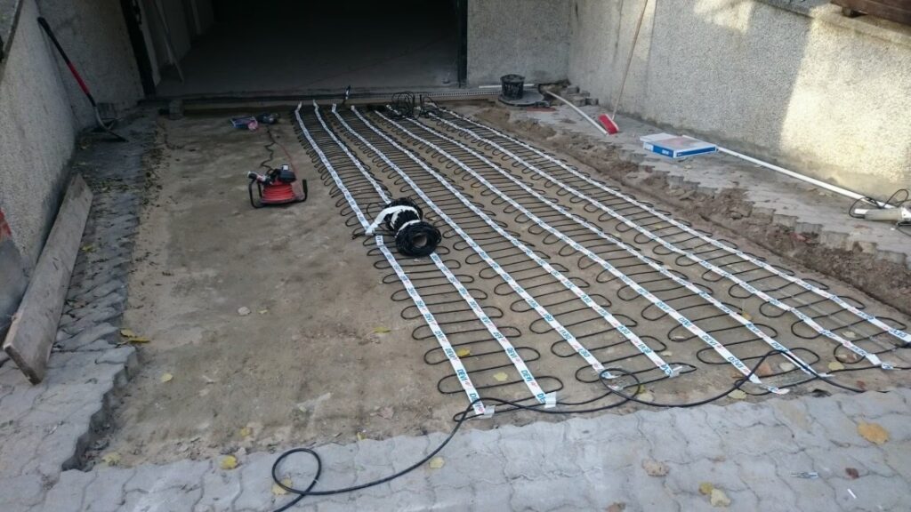 - Instalacja kabli lub mat grzewczych: Kable lub maty grzewcze są instalowane bezpośrednio w nawierzchni podjazdu – w świeżym betonie, pod kostką brukową lub w asfalcie. Ważne jest zachowanie odpowiednich odstępów między kablami, aby zapewnić równomierne rozprowadzenie ciepła.