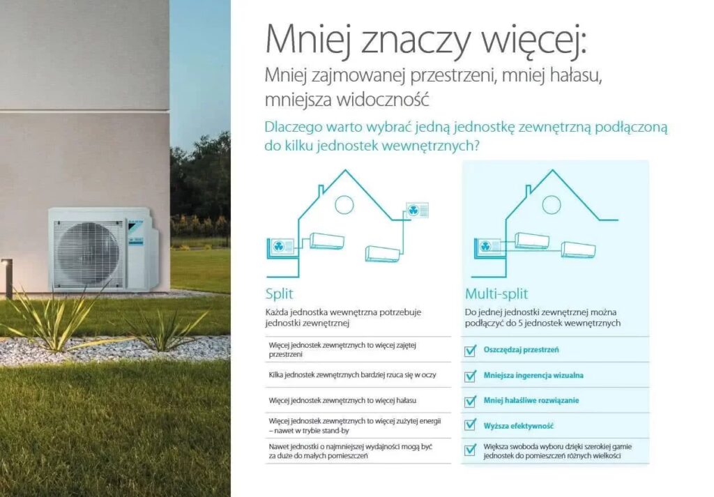 - Klimatyzatory typu split: Składają się z jednostki zewnętrznej i wewnętrznej. Są ciche, wydajne i energooszczędne. Systemy split są idealne do chłodzenia pojedynczych pomieszczeń lub całych domów (systemy multi-split).