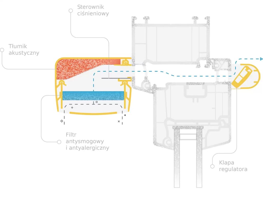 - Oszczędzamy energię, ponieważ kontrolowany dopływ powietrza przez nawiewniki minimalizuje straty ciepła w porównaniu do tradycyjnego wietrzenia.