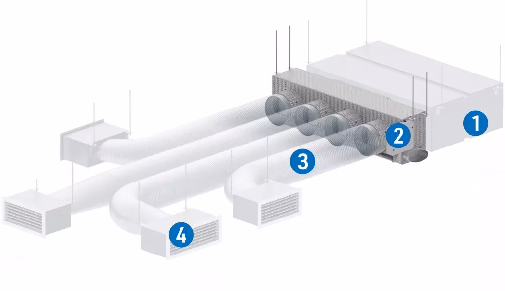 System kanałów wentylacyjnych: Sieć rur, zazwyczaj wykonanych z metalu lub elastycznego tworzywa, która rozprowadza ogrzane lub schłodzone powietrze z jednostki centralnej do różnych pomieszczeń w domu. Kanały te są kluczowym elementem dystrybucji powietrza w systemach HVAC.