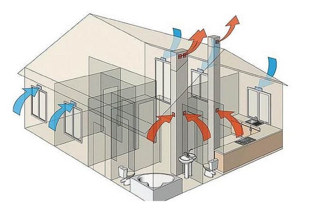 - Wentylacja mechaniczna wywiewna: Powietrze jest usuwane z pomieszczeń za pomocą wentylatorów, a świeże powietrze napływa przez nawiewniki lub nieszczelności.