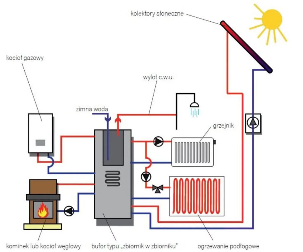 Bufor ciepła odgrywa kluczową rolę w systemie grzewczym z kotłem na paliwo stałe. Jego zadaniem jest akumulacja nadmiaru ciepła wytworzonego przez kocioł. Kiedy kocioł pracuje z pełną mocą, a zapotrzebowanie na ciepło w domu jest mniejsze, nadmiar ciepła jest magazynowany w buforze. Następnie, gdy kocioł przestaje pracować lub pracuje z mniejszą mocą, zmagazynowane ciepło jest stopniowo uwalniane do instalacji grzewczej, zapewniając ciągłość ogrzewania.