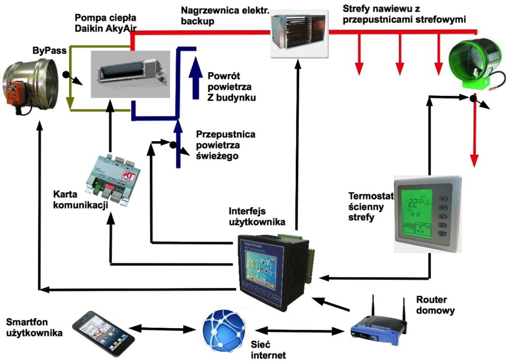 - Podłączenie elektryczne i automatyki: Urządzenia systemu, takie jak centrala wentylacyjna, pompa ciepła i grzałka elektryczna, wymagają podłączenia do instalacji elektrycznej. Konieczne jest również podłączenie i konfiguracja sterowników, które regulują pracę systemu.