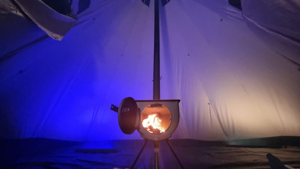 - Konstrukcja namiotu: Namiot powinien być przeznaczony do ogrzewania. Ważne są otwory na komin, ognioodporne materiały w strategicznych miejscach i dobra wentylacja.
