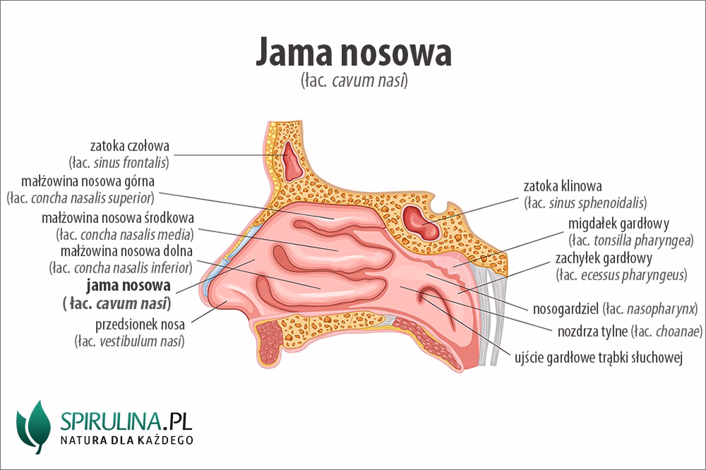 • Nawilżanie powietrza: Błona śluzowa jamy nosowej wydziela wilgoć, nawilżając wdychane powietrze, co jest kluczowe dla ochrony delikatnych dróg oddechowych.