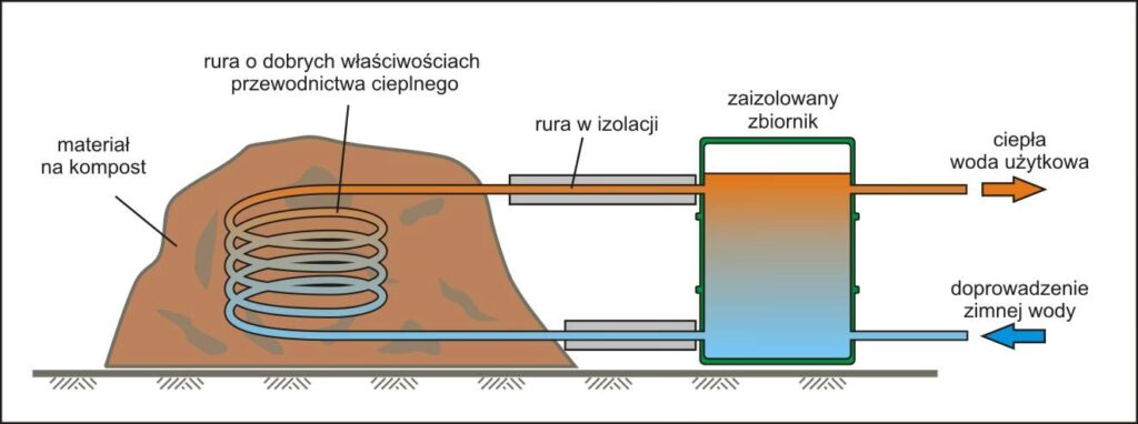 Ciepło z kompostu można wykorzystać do ogrzewania wody lub powietrza, stosując systemy rur lub kompostowe kolektory słoneczne.