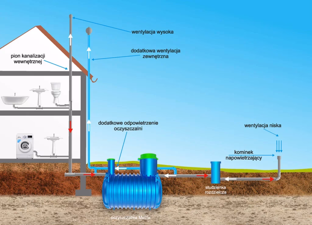 - Wykonanie wentylacji: Osadnik gnilny powinien być wyposażony w system wentylacji, który odprowadza gazy powstające w procesach beztlenowych. Wentylacja jest ważna dla bezpieczeństwa i prawidłowego funkcjonowania systemu.
