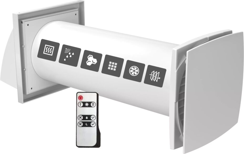 Sercem systemu wentylacji decentralnej jest rekuperator ścienny. Montuje się go bezpośrednio w ścianie zewnętrznej pomieszczenia. Typowy rekuperator ścienny składa się z: