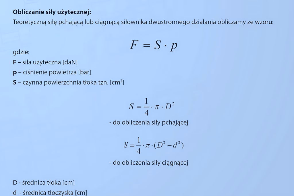 Siłę teoretyczną siłownika pneumatycznego oblicza się ze wzoru: siła teoretyczna = ciśnienie * czynna powierzchnia tłoka. Siła użytkowa uwzględnia współczynnik strat: siła użytkowa = ciśnienie * czynna powierzchnia tłoka * współczynnik η.