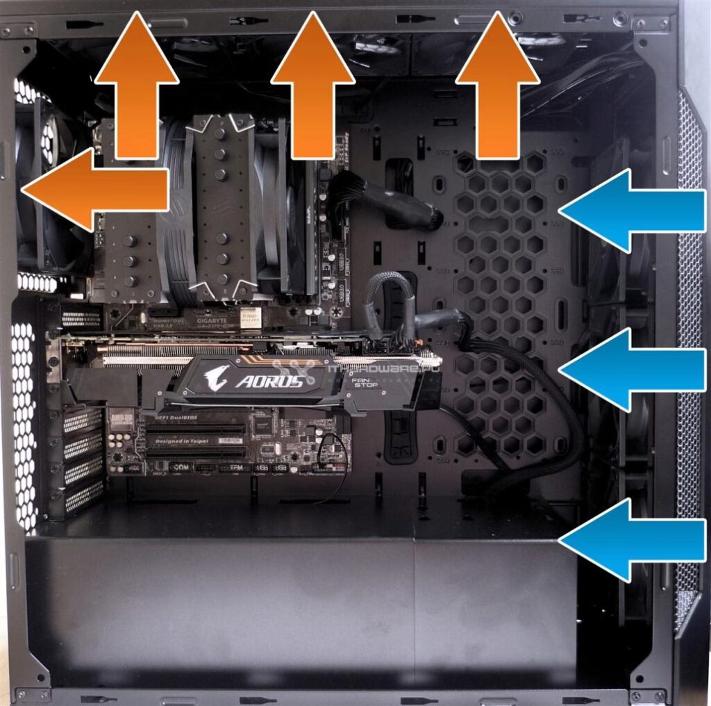Ustawienie wentylatorów w dół pozwala na przepływ większej ilości powietrza przez GPU . Pozwala to również na większą kontrolę nad zarządzaniem kierunkiem przepływu powietrza.