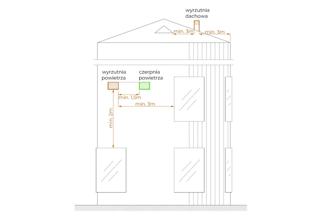 - Umieszczaj wloty powietrza świeżego z dala od potencjalnych źródeł zanieczyszczeń, takich jak parkingi, ulice o dużym natężeniu ruchu, miejsca składowania odpadów, czy kominy.